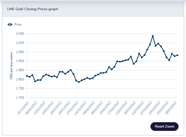 Seit Anfang 2022 ist der Goldpreis um bis zu 12 % gestiegen. In der Zeit vom 08.03. bis zum 22.03. fiel der Goldpreis jedoch um 5%. Ob der Goldpreis weiter fallen wird, ist schwer vorherzusagen. Man könnte nur spekulieren, dass sich der Goldpreis in naher Zukunft nicht wesentlich ändern und mindestens bis Ende März stabil bleiben wird
