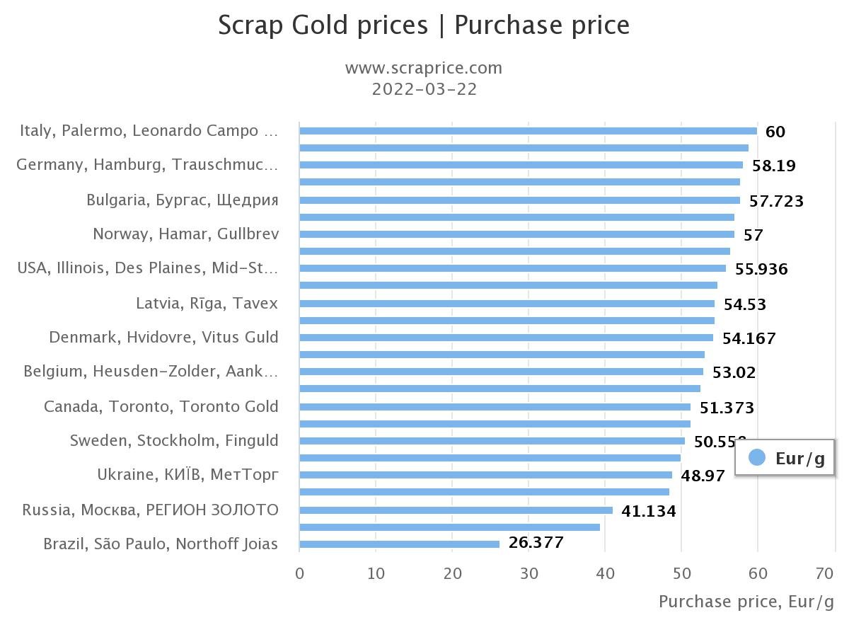 Goldkäufer haben auch ihre Gold ankaufspreise erhöht. Laut der Website scraprice.com konnte am 22. März 2022 24 Karat Gold für bis zu 60 Eur / g verkauft werden. Es gibt mehrere Länder, in denen Gold am meisten gekauft wurde, nämlich Deutschland, Polen und Großbritannien.